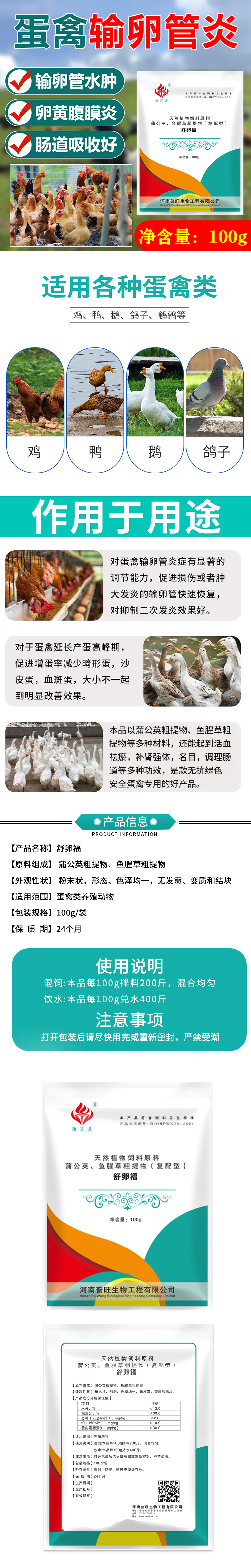 產品簡介:蛋禽產蛋期因生理、疾病因素導致的輸卵管、卵巢急慢性炎等。