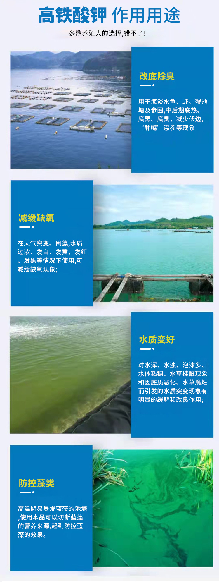輕松養殖,助力水產。增加水體的溶氧量對水體中氨氮、亞硝酸鹽水藻類具有良好的去除效果凈化水質殺菌改底祛除異味。" />