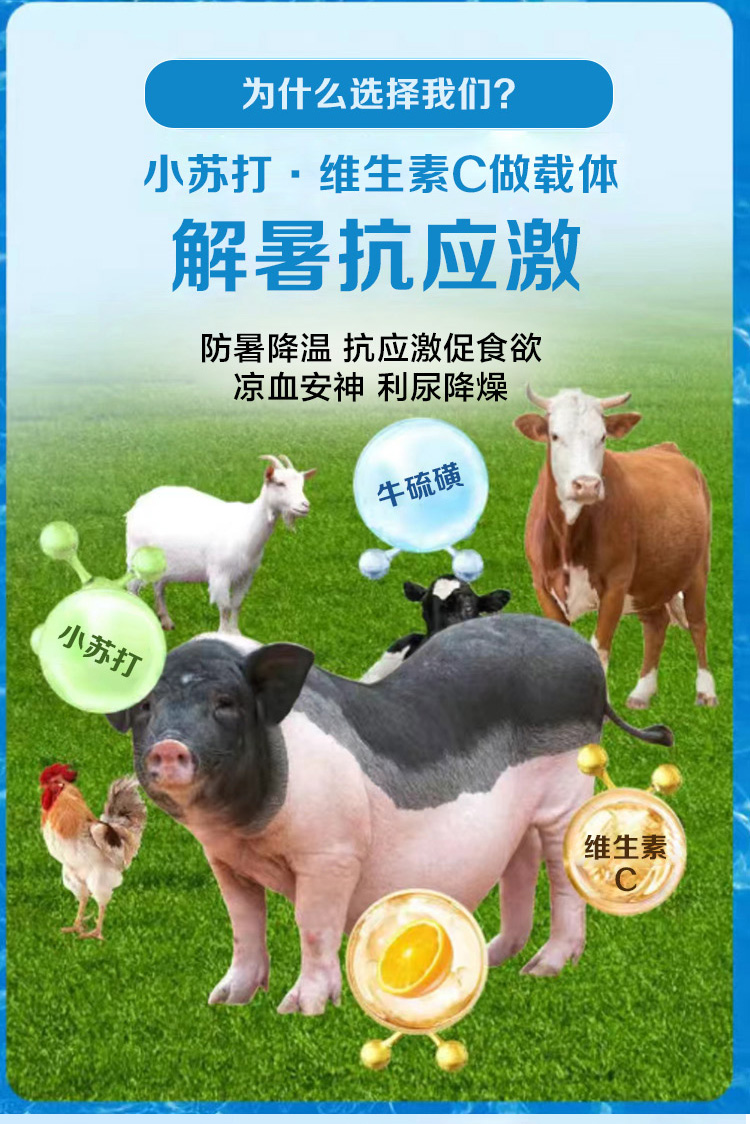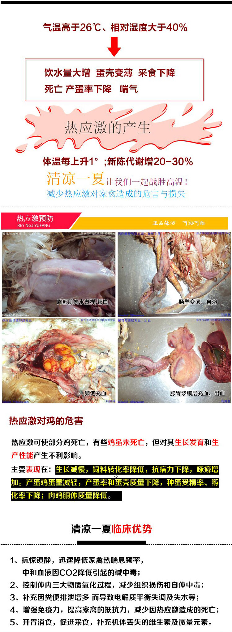 產(chǎn)品簡(jiǎn)介:防暑降溫 涼血安神 利尿降燥 抗應(yīng)激 促食欲 純中藥 深調(diào)理 炎熱食不減 豬牛羊冰爽早預(yù)防 少死亡 多掙錢。防止畜禽中暑死亡、抗應(yīng)激、補(bǔ)充營(yíng)養(yǎng)。小蘇打·維生素C做載體,解暑抗應(yīng)激,防暑降溫,抗應(yīng)激促食欲,涼血安神,利尿降噪。