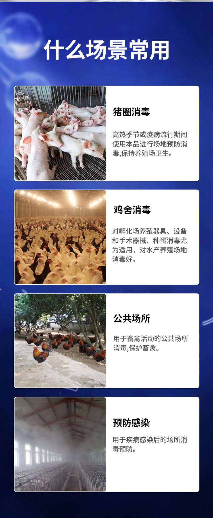 產品簡介:用于家禽、家畜、水產養殖等的緊急消毒和預防消毒,防止疫情暴發。