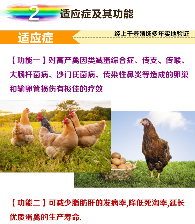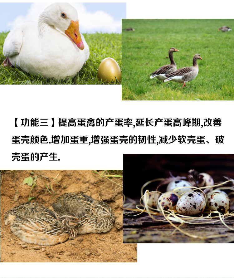 1. 延長雞產蛋高峰  2.增加產蛋率蛋重  3.防治雞輸卵管炎  4.促進雞卵泡發育  5.防治產蛋疲勞癥