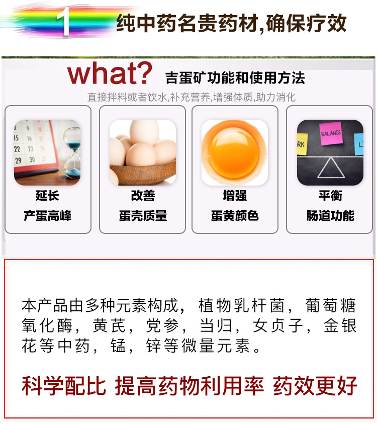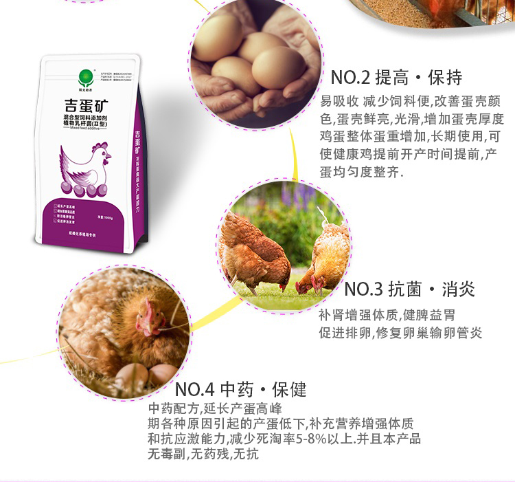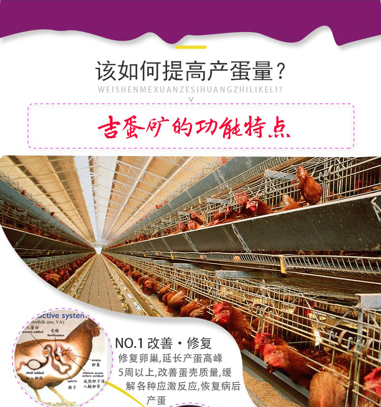 產蛋多了:本品激活卵巢功能,促進卵泡發育、成熟與排卵,延長產蛋高峰期。使用吉蛋礦15-20天,產蛋率可增